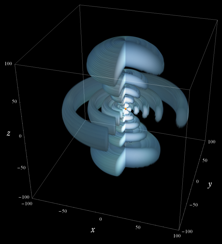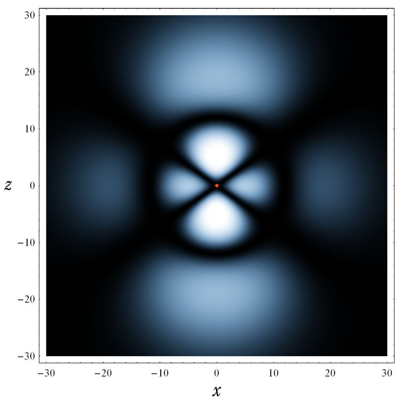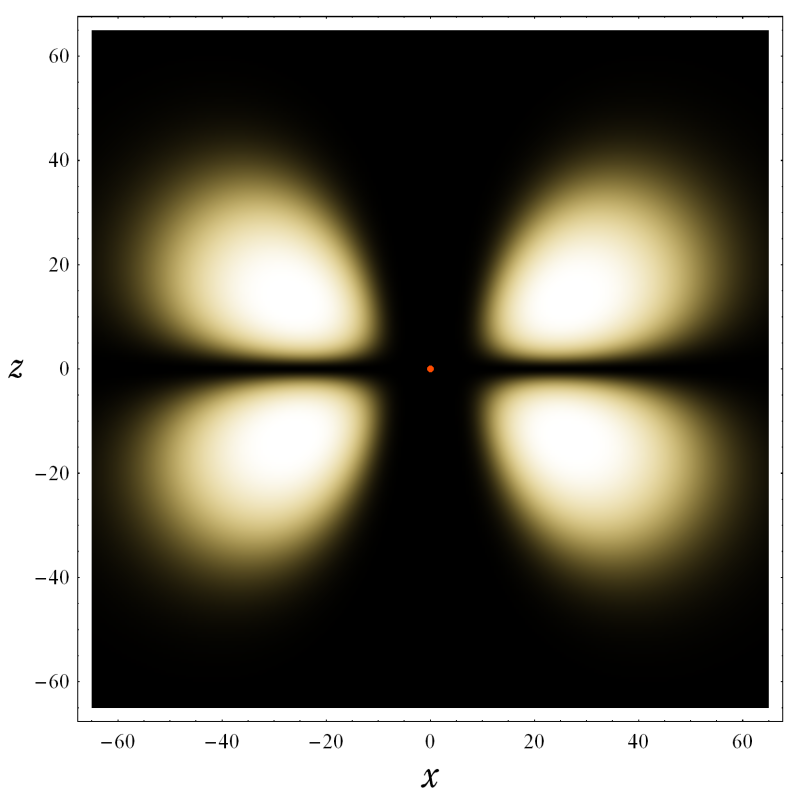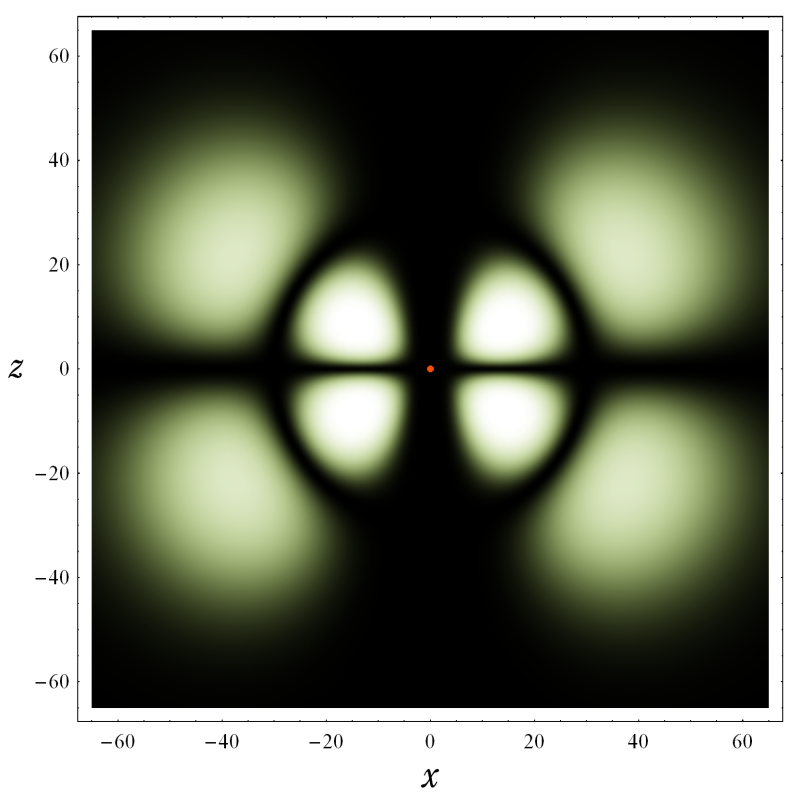 前述の解なお、電子雲の色は疑似カラーであって、現実とは異なる (可視光線の波長は原子半径の概ね数千倍もあるので、原子の規模について色を問うこと自体が無意味)。また、原点にある原子核を強調するため赤点を置いたが、その電子雲に対する実際の大きさは、図よりも遙かに小さい。