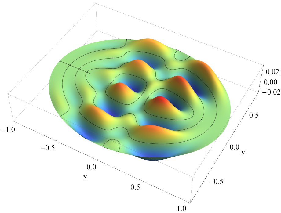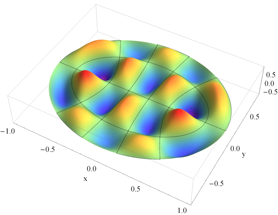 楕円形膜の振動の一般的な例として、複数個の固有振動関数を足し合わせた場合を以下に示す。これは、時刻①②: