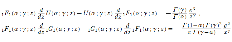 さらに、合流型超幾何関数の導関数については、第1種と第2種の間でロンスキアン型の関係式