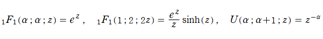 多くの特殊関数は、合流型超幾何関数によって表わすことができる。具体的な表示式は、既に不完全ガンマ関数、積分指数関数、誤差関数、Bessel 関数、Hermite 関数、放物柱関数、Laguerre 陪関数、および Coulomb 波動関数の頁に掲載した※4。さらに、この頁の後半では Whittaker 関数、二三の関連関数についても触れる。