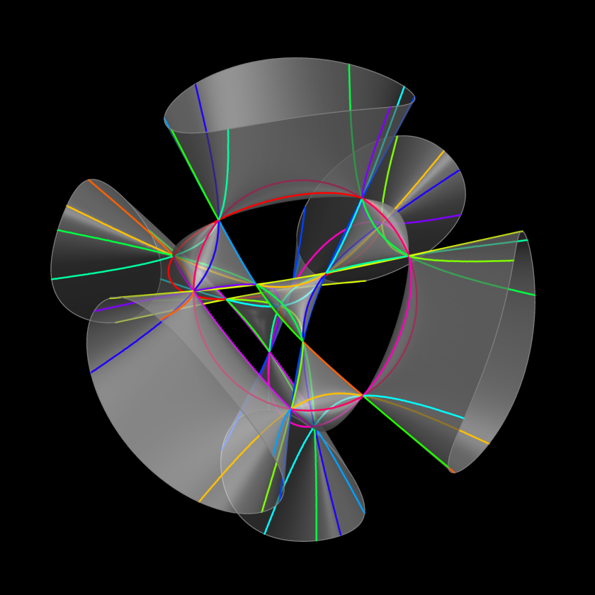 ②:Kummer 曲面上にある16個の二次曲線 (12個の双曲線と4個の円)。これは、四次代数曲面上に取れる二次曲線の最大個数である。→